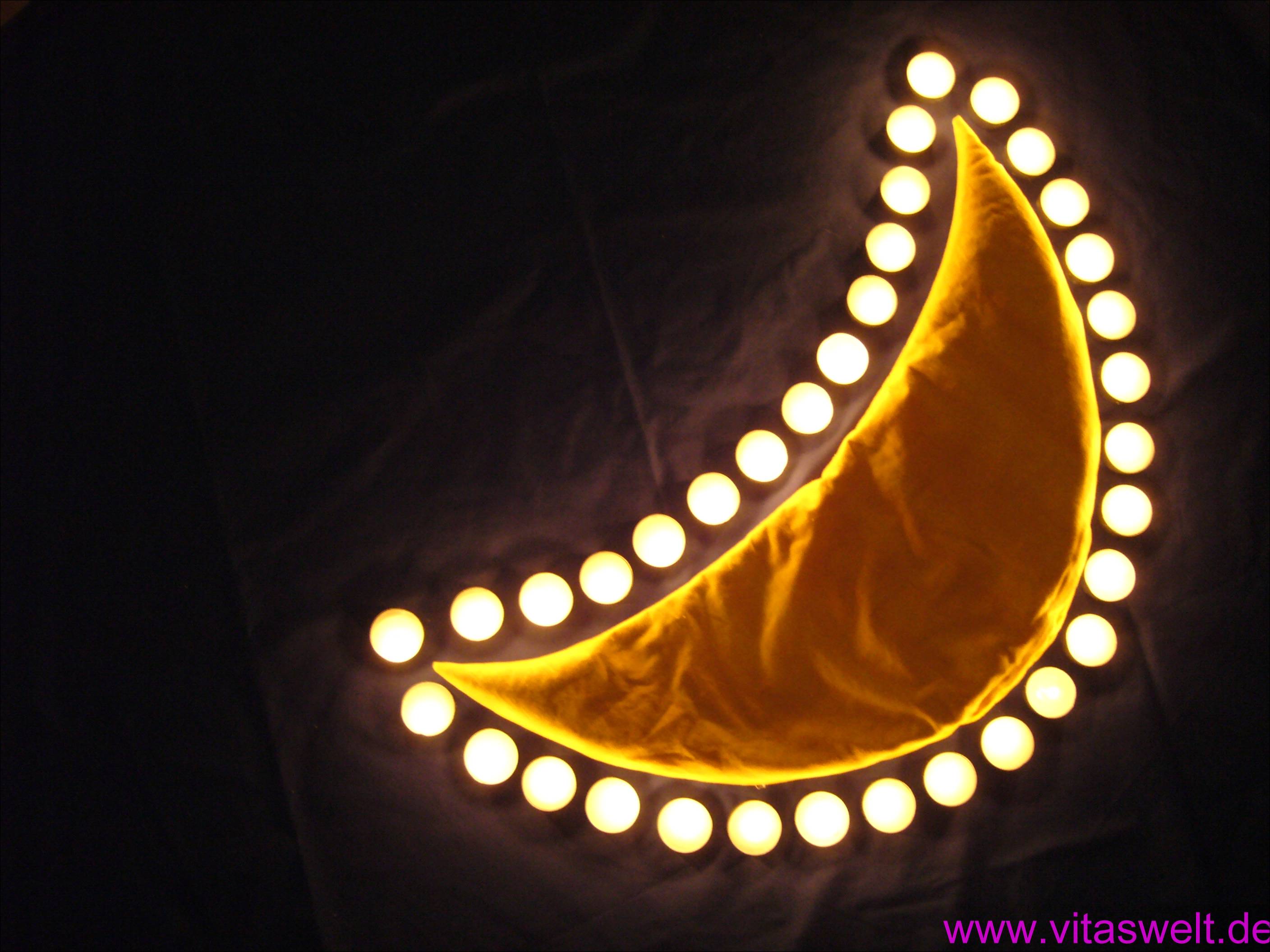| V07 Sichelförmiger, halbliegender Mond auf tiefdunkelblauem Hintergrund. Die Mondform wird außen von 44 brennendem Teelichtern beschrieben. Innen liegt ein gelbes Kissen in Mondform, von dessen Rändern sich nach innen hin die Farben von goldgelb zu glutrot verfärben. Durch die leichten Falten im Stoff sieht der Mond aus, wie mit Kratern und Furchen durchzogen. Auf Wunsch mit Beschriftung. Mail mit der Karte V07 versenden Karte V07 bestellen Karte V07 vergrößern | |