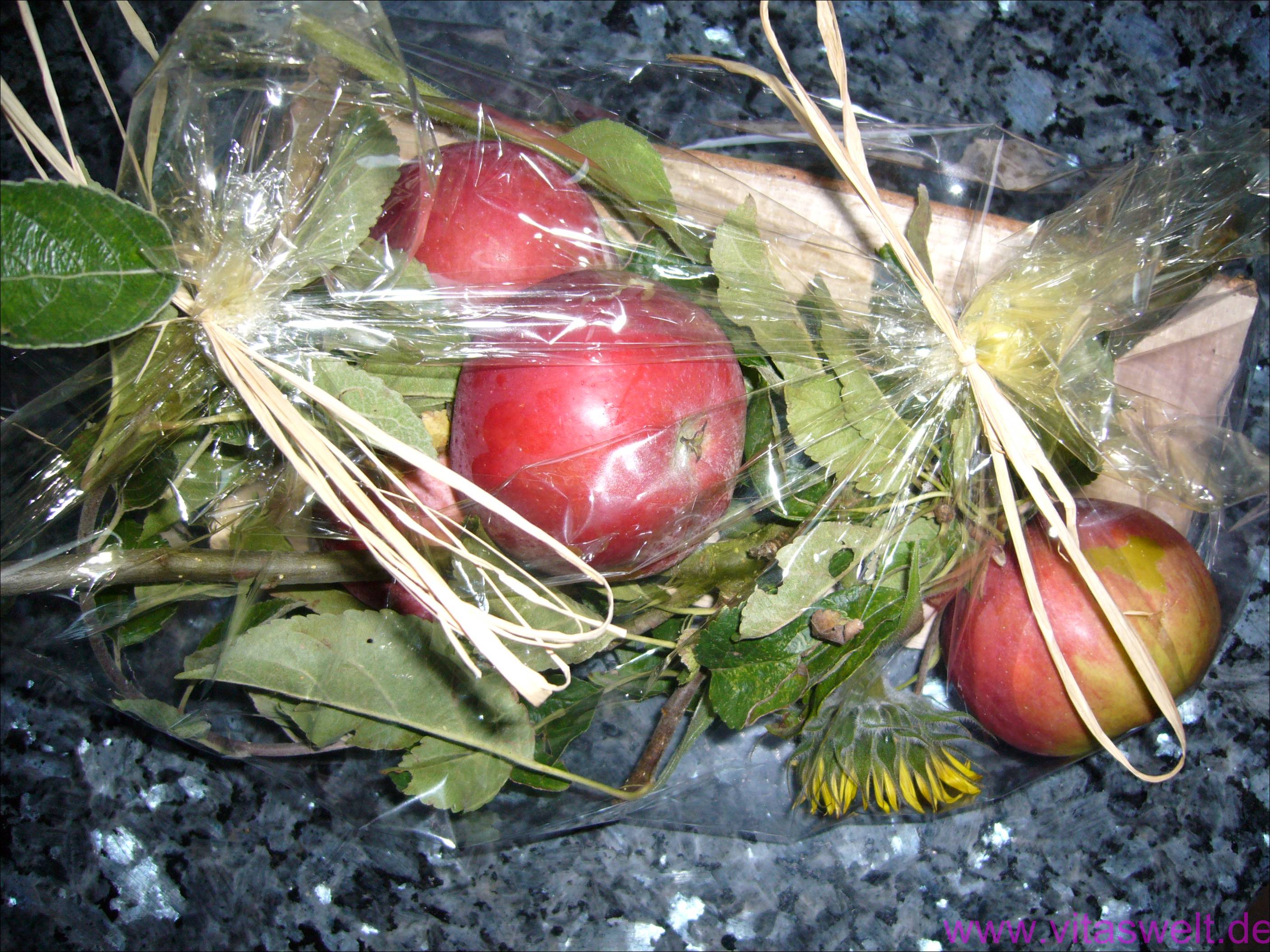 | V04 Auf einer Holzscheibe liegen drei rotbackige Äpfel auf abgeschnittenen Ästen mit grünem Blattlaub. Dazwischen liegt eine Sonnenblume. Alles ist eingepackt in eine Transparentfolie mit zwei Schleifen aus Sisalfäden. Hintergrund Blau-glitzernder Stein. Mail mit der Karte V04 versenden Karte V04 bestellen Karte V04 vergrößern | |