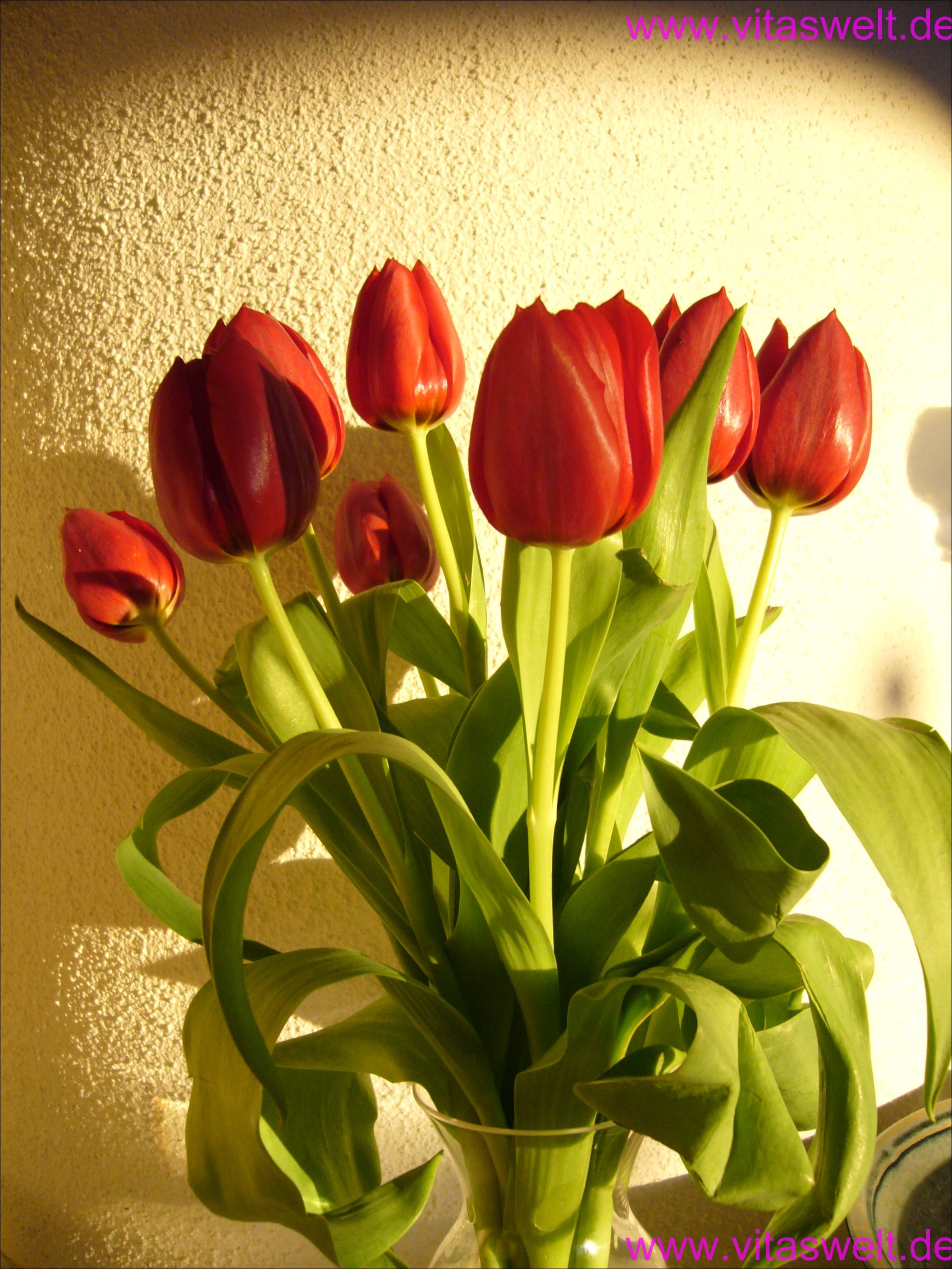 | V11** Fotografie eines roten Tulpenstraußes vor feingekörnter weißer Putzwand. Glasvase,Blattgrün, Blüten und Wand werden in warmes Licht einer tiefstehenden Sonne getaucht. Am oberen Bildrand entsteht ein gewölbter Schatten. Stimmungsvoll. Mail mit der Karte V11 versenden Karte V11 bestellen Karte V11 vergrößern | |