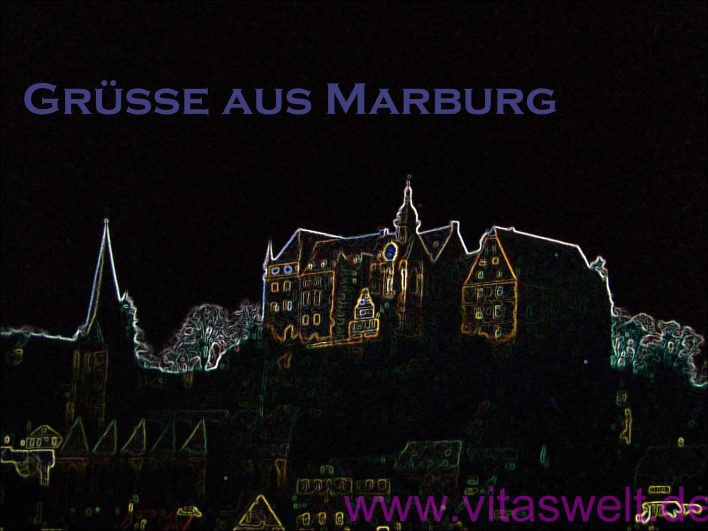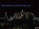 | V15** "Grüße aus Marburg in alter, dunkellila Schrift über der nächtlichen Silhouette des Schlosses und der Pfarrkirche. Das ganze sieht märchenhaft -gespenstig aus. Eine besondere Ver- fremdung. Mail mit der Karte V15 versenden Karte V15 bestellen Karte V15 vergrößern | |
