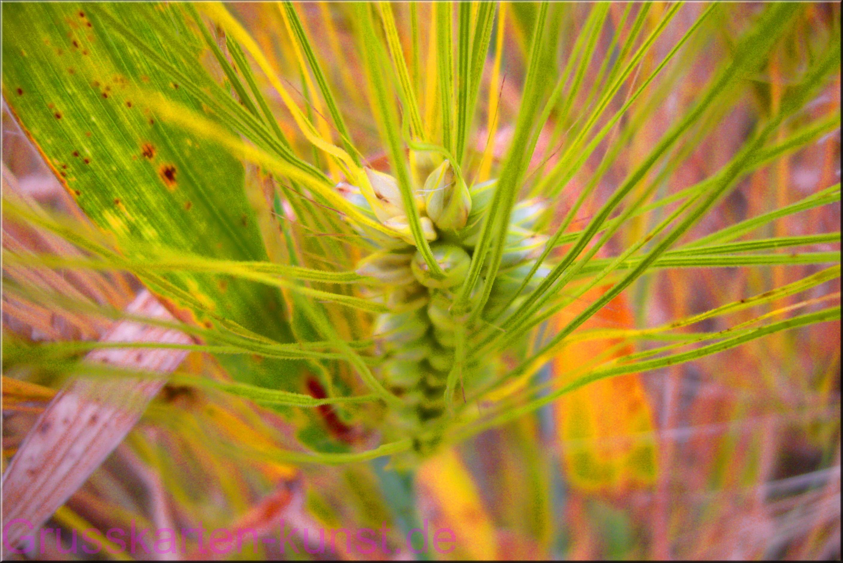 | V41 Eine Gerstenrispe streckt sich mit ihren langen Grannen dem Betrachter entgegen. Diese Nahaufnahme wurde mit einem Bildbearbeitungsprogramm farblich überzeichnet, sodass fast neonfarbige Bildelemente den Betrachter überraschen. Grell und besonders. Mail mit der Karte V41 versenden Karte V41 vergrößern | |