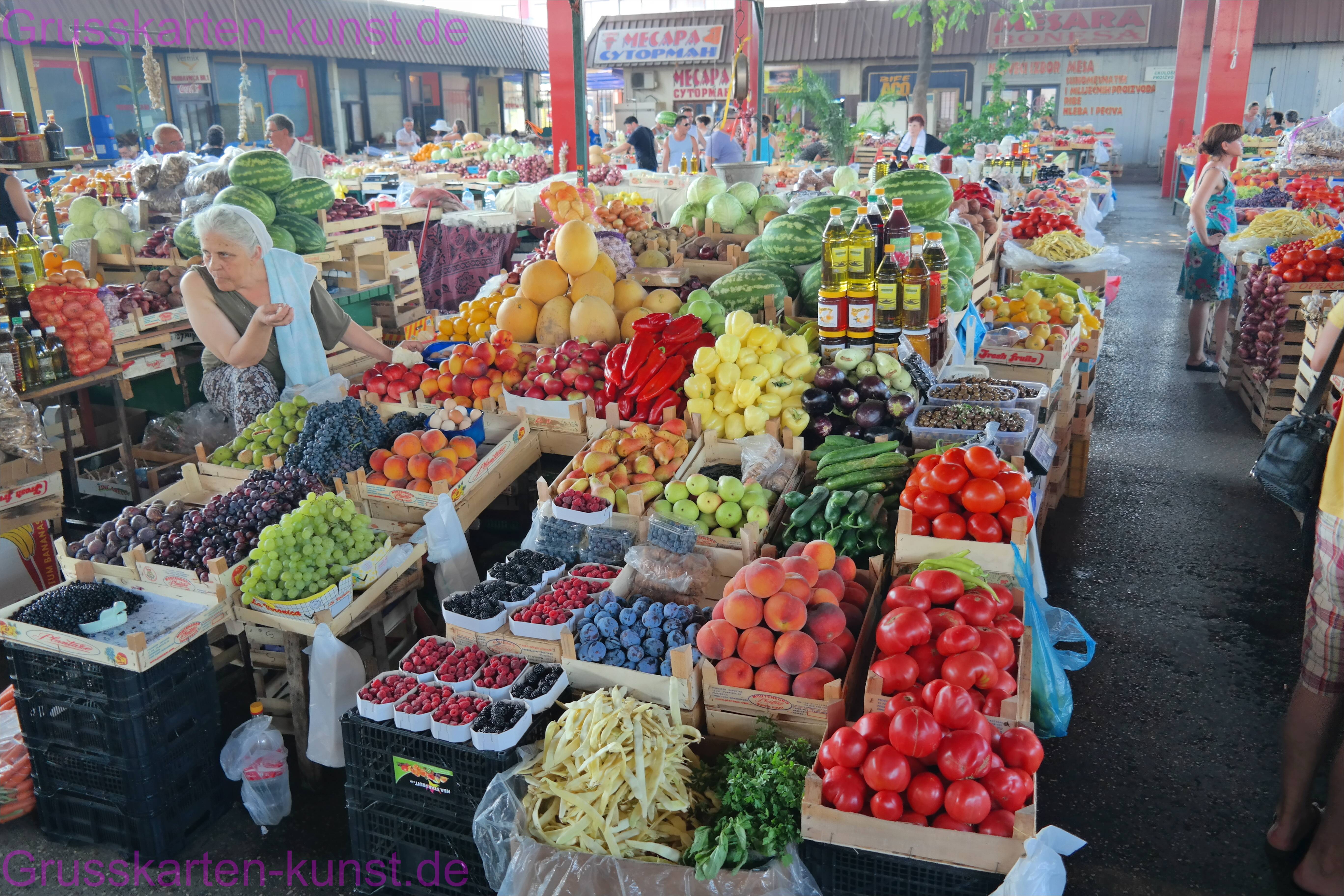 | V43 Ein Marktstand in einer Markthalle in Montenegro. Von schräg oben auf den rechteckig aufgebauten Stand fotografiert. Eine alte Frau mit Kopftuch, im Hintergrund geschäftiges Treiben. Blaubeeren, Himbeeren, Brombeeren, gelbe Bohnen, Koriander, Tomaten, Paprika, Pfirsiche, nektarinen, Honig- und Wassermelonen, Trauben rot und grün, Pflaumen, Zuccini, Auberginen, Gurken, Birnen, Eier, Feigen, Oliven, Zitronen, Zwiebeln, Koblauch, Kartoffeln, Weißkohl, Zuckerrüben, Kiwi, Äpfel, Pepperoni, Honig, Olivenöl. Vieles in verschiedenen Größen und Farben(wie z.B. Paprika). Eine üppige Vielfalt und in der Regel alles aus dem eigenen Land. Farbenfrohes Foto. Als Suchbild oder "treibs nicht zu bunt" zu versenden? Mail mit der Karte V43 versenden Karte V43 vergrößern | |