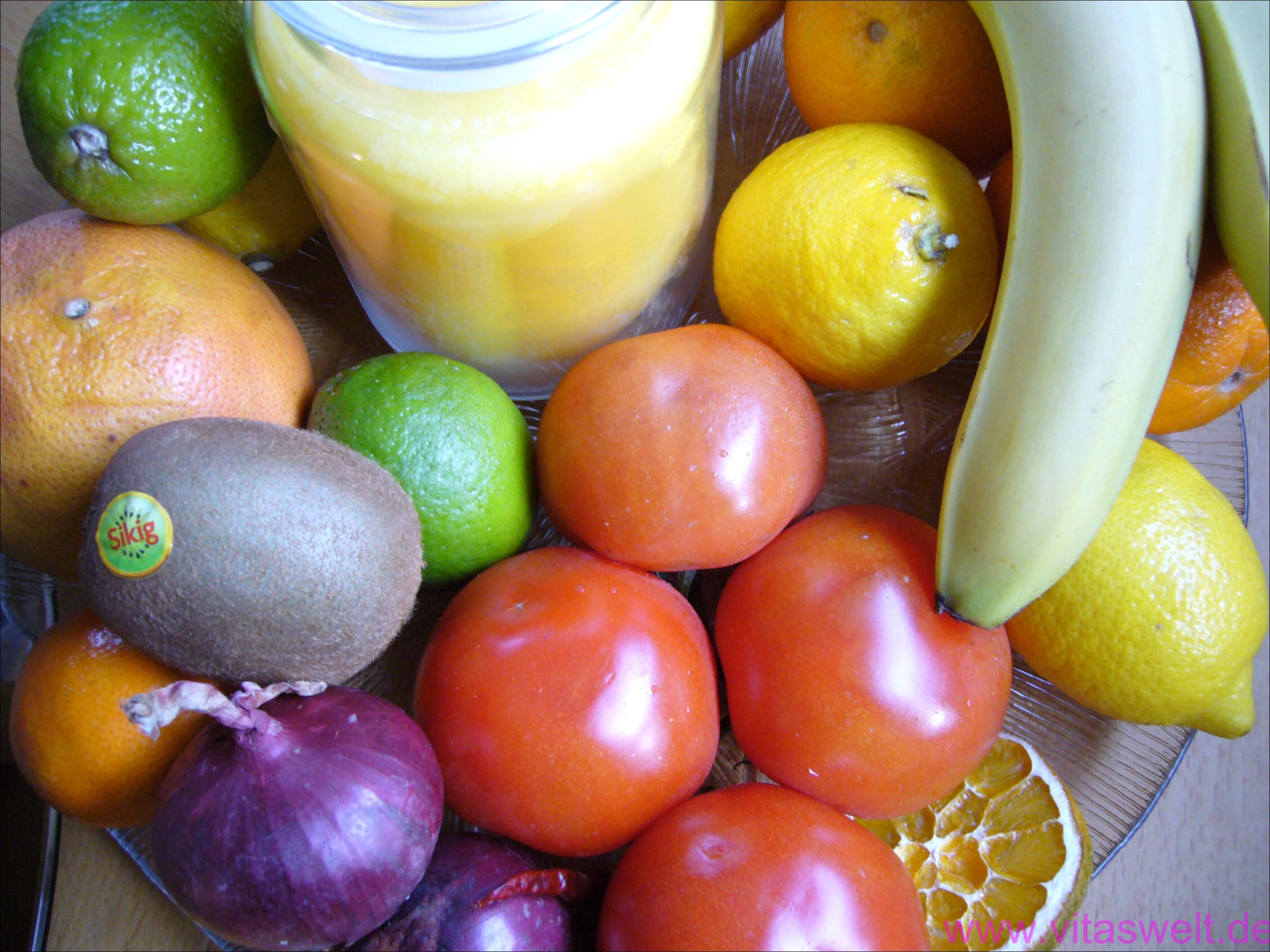 | V05 Obst- und Gemüseschale mit Bananen, Limetten, Zitronen, Tomaten, Kiwi, roten Zwiebeln und Orangen. Wirkt fruchtig und farbenfrisch. Mail mit der Karte V05 versenden Karte V05 bestellen Karte V05 vergrößern | |
