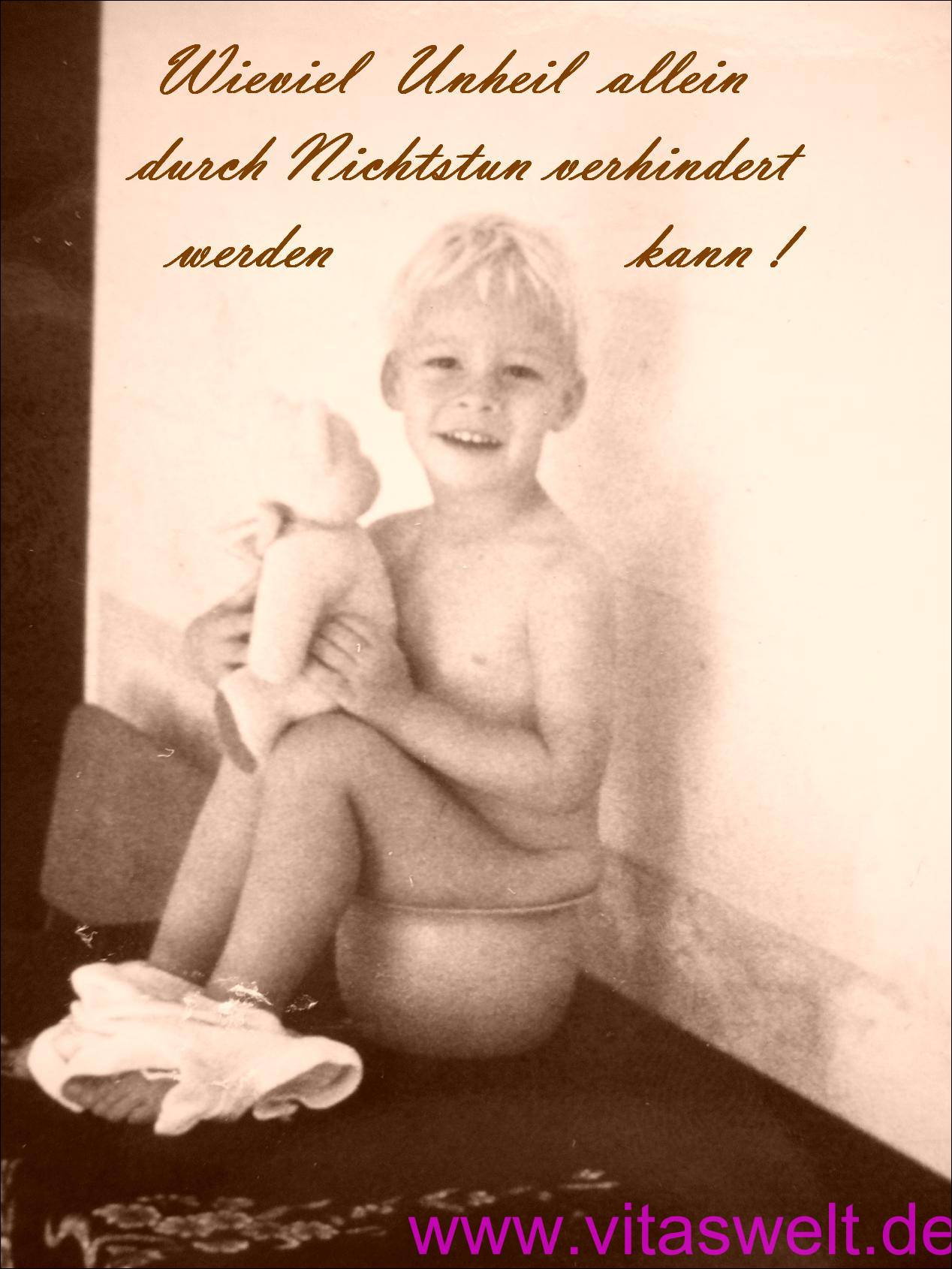 | Z09 "Wieviel Unheil allein durch Nichtstun verhindert werden kann! Ein kleiner blonder Junge sitzt mit Heruntergelassener Hose und angewinkelten Beinen, einen Teddy auf den Knieen haltend auf einem Töpfchen. Sepiafarben(veraltert) mit brauner Schrift. Mail mit der Karte Z09 versenden Karte Z09 bestellen Karte Z09 vergrößern | |