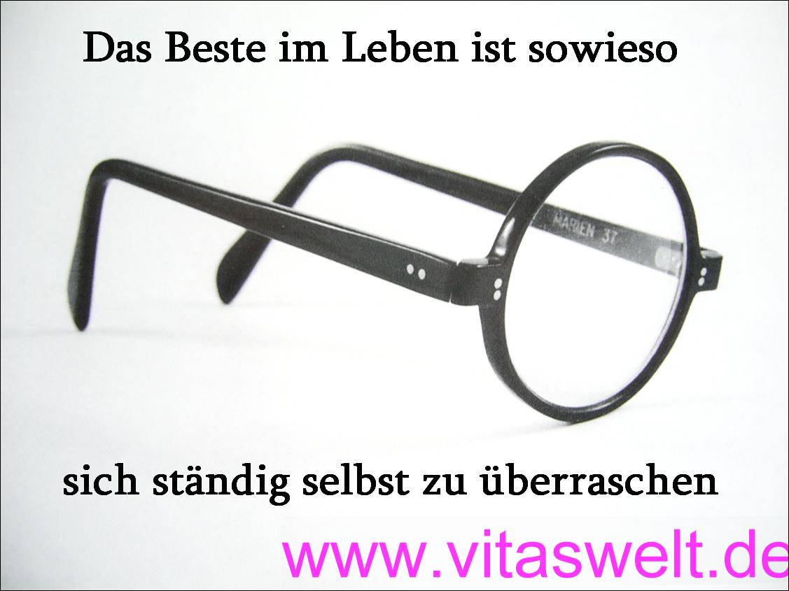 | Z10 "Das Beste im Leben ist sowieso, sich ständig selbst zu überraschen! Schriftzug oben und unten auf einer s/w Karte auf der eine Brille mit nur einem Glas in nur einer Fassung abgebildet ist. Trotzdem hat die Fassung zwei Bügel. Da guckt man etwas verwirrt hin. Mail mit der Karte Z10 versenden Karte Z10 bestellen Karte Z10 vergrößern | |