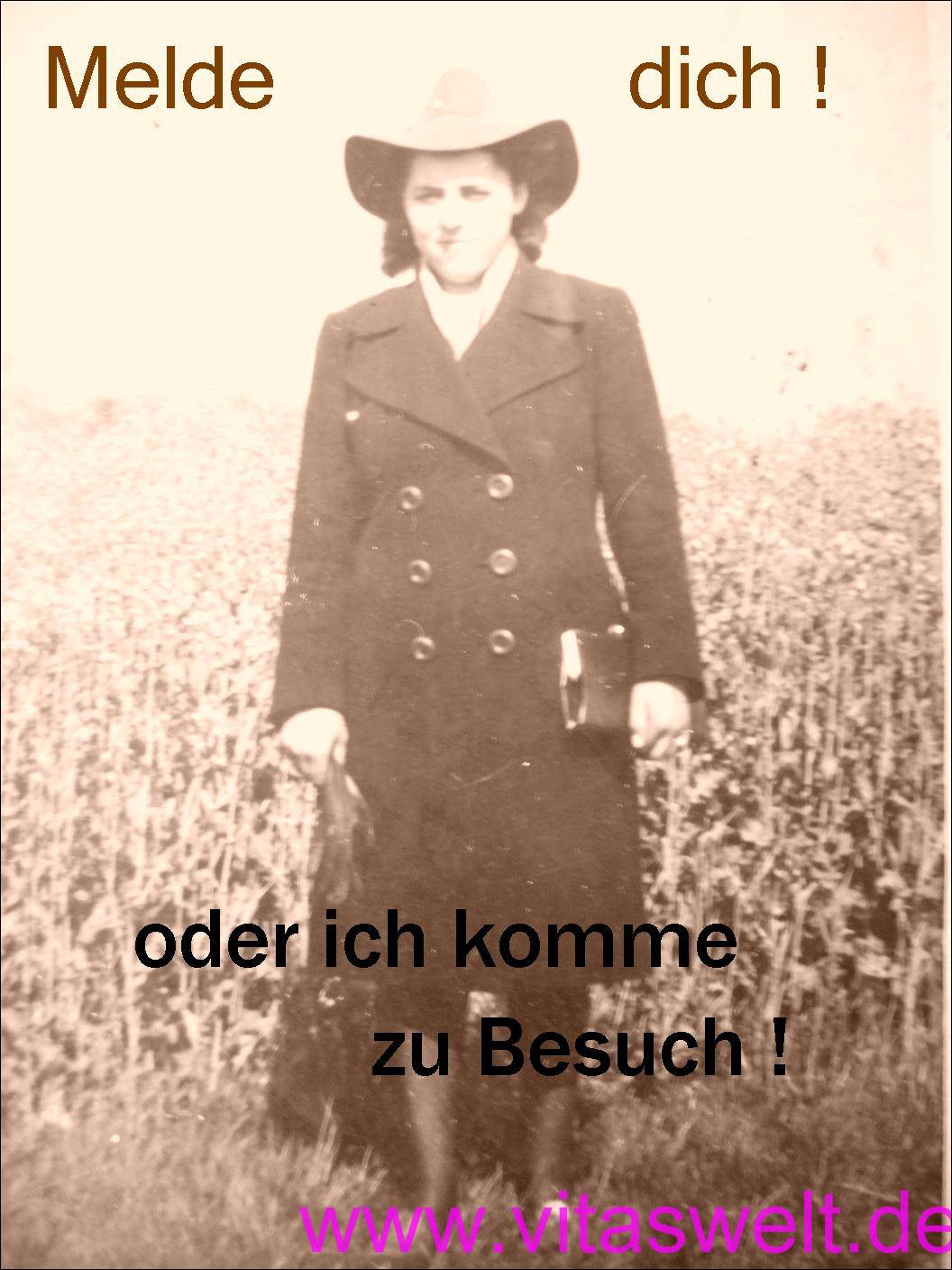 | Z11 Melde dich! oder ich komme zu Besuch! Spruch auf einem alten vergilbten Foto, auf dem eine streng wirkende Frau mit Krempenhut und dunklem Mantel sowie Handtasche und Blumensträußchen zu sehen ist. Mail mit der Karte Z11 versenden Karte Z11 bestellen Karte Z11 vergrößern | |