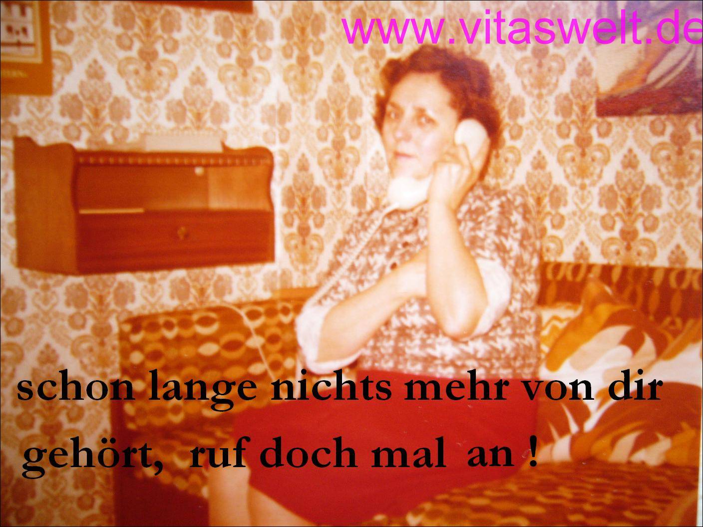 Z13 "Schon lange nichts mehr von dir gehört. Ruf doch mal an!" Spruch auf vergilbtem Foto auf dem eine Dame in den 50igern auf einer Couchkante sitzt und einen Telefonhörer in den Händen hält. Sie guckt konzentriert und hat eine blumige Bluse und Rock an. Ebenso blumig ist die Tapete und die Couch. Wirkt kitschig, steif und altbacken | |