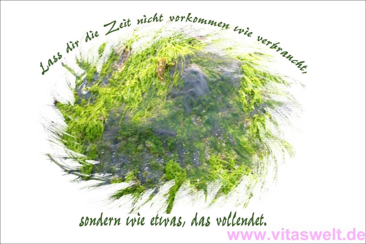 | Z21 "Lass dir die Zeit nicht vorkommen, wie verbraucht, sondern wie etwas, das vollendet." Erster Teil im Halbrund und dunkel-grün um die Abbildung geschrieben. Zweiter Teil am unteren Kartenrand. Abgebildet ist eine Fotografie eines Basaltsteines, der von fluoreszierend grünen Algenfäden eingenommen wurde. Leuchtende Grüntöne bis hin zu Anthrazitgrau. Das Foto wurde am Rand technisch "zerfranzt", sodass vor weißem Hintergrund eine ovale und dynamische Form entsteht. Hingucker. Mail mit der Karte Z21 versenden Karte Z21 bestellen Karte Z21 vergrößern | |