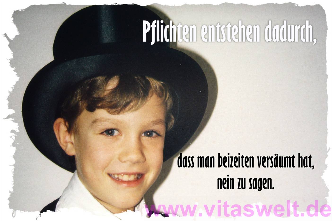 | Z22 "Pflichten entstehen dadurch, dass man beizeiten versäumt hat, nein zu sagen." Die am Rand "abgerissene" Karte zeigt einen lächelnden, etwa 7 jährigen Jungen mit Pony und weißem Hemdkragen, der einen schwarzen Zylinder trägt. Der Hintergrund ist grau-weiß. Der Schriftzug schwarz und weiß schattiert. Mail mit der Karte Z22 versenden Karte Z22 bestellen Karte Z22 vergrößern | |
