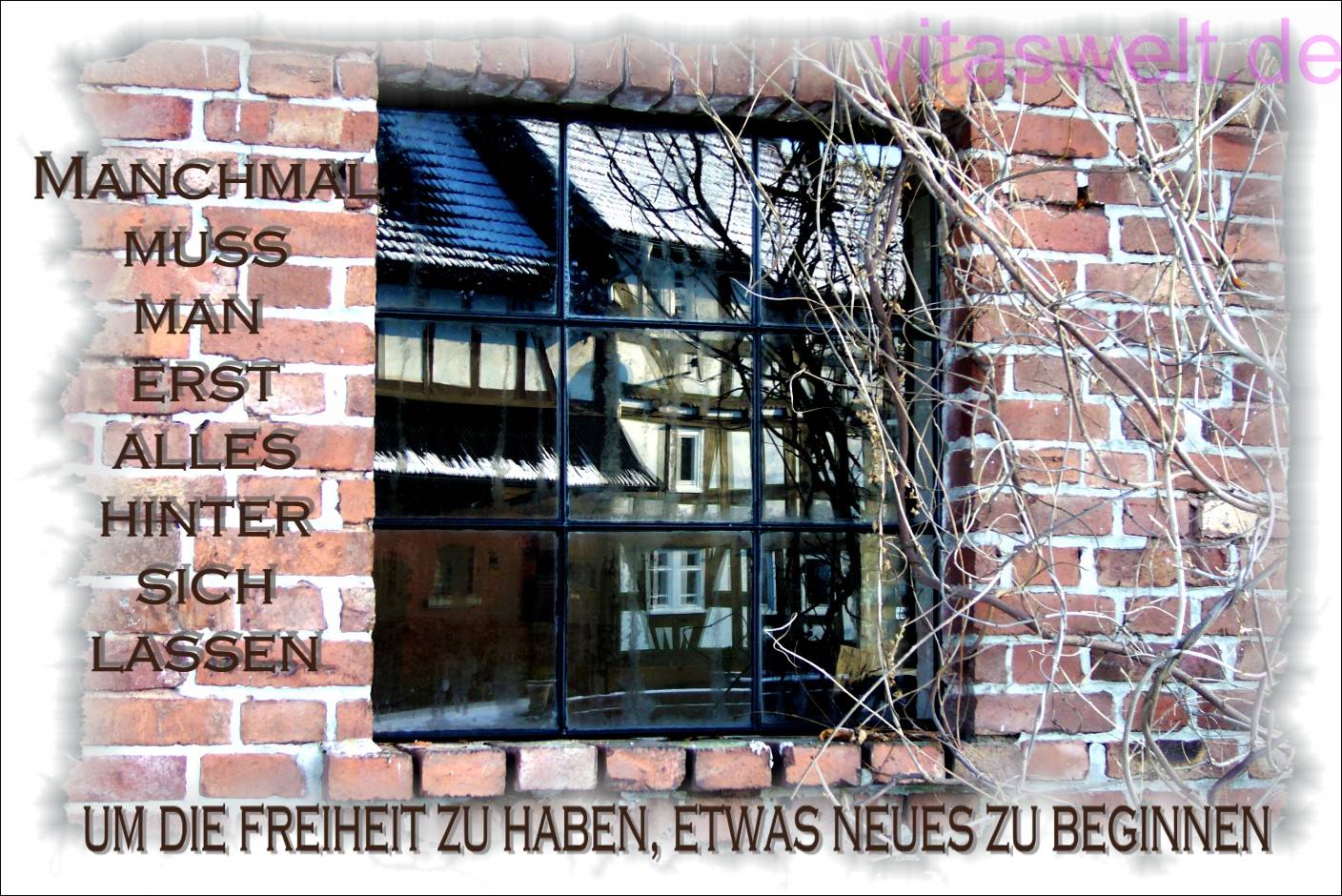 | Z26 "Manchmal muss man erst alles hinter sich lassen, um die Freiheit zu haben, etwas neues zu beginnen." Dieser Spruch steht auf einer roten Backsteinwand mit großen Fugen geschrieben. In der Mitte der Wand ist ein Fenster eingelassen. Hier spiegelt sich ein Fachwerkhaus, welches von der Sonne beschienen wird. Man sieht ein Fenster, einen Hauseingang und ein schwarzes Dach mit leichtem Schneepuder bedeckt. Am rechrten Rand schlängelt sich knorriges Geäst empor und verdeckt dabei Teile des Fensters. Tolle Perspektive. Sozusagen der Blick Ruzück oder Rausvor? Mail mit der Karte Z26 versenden Karte Z26 bestellenKarte Z26 vergrößern Zurück zum Seitenanfang | |