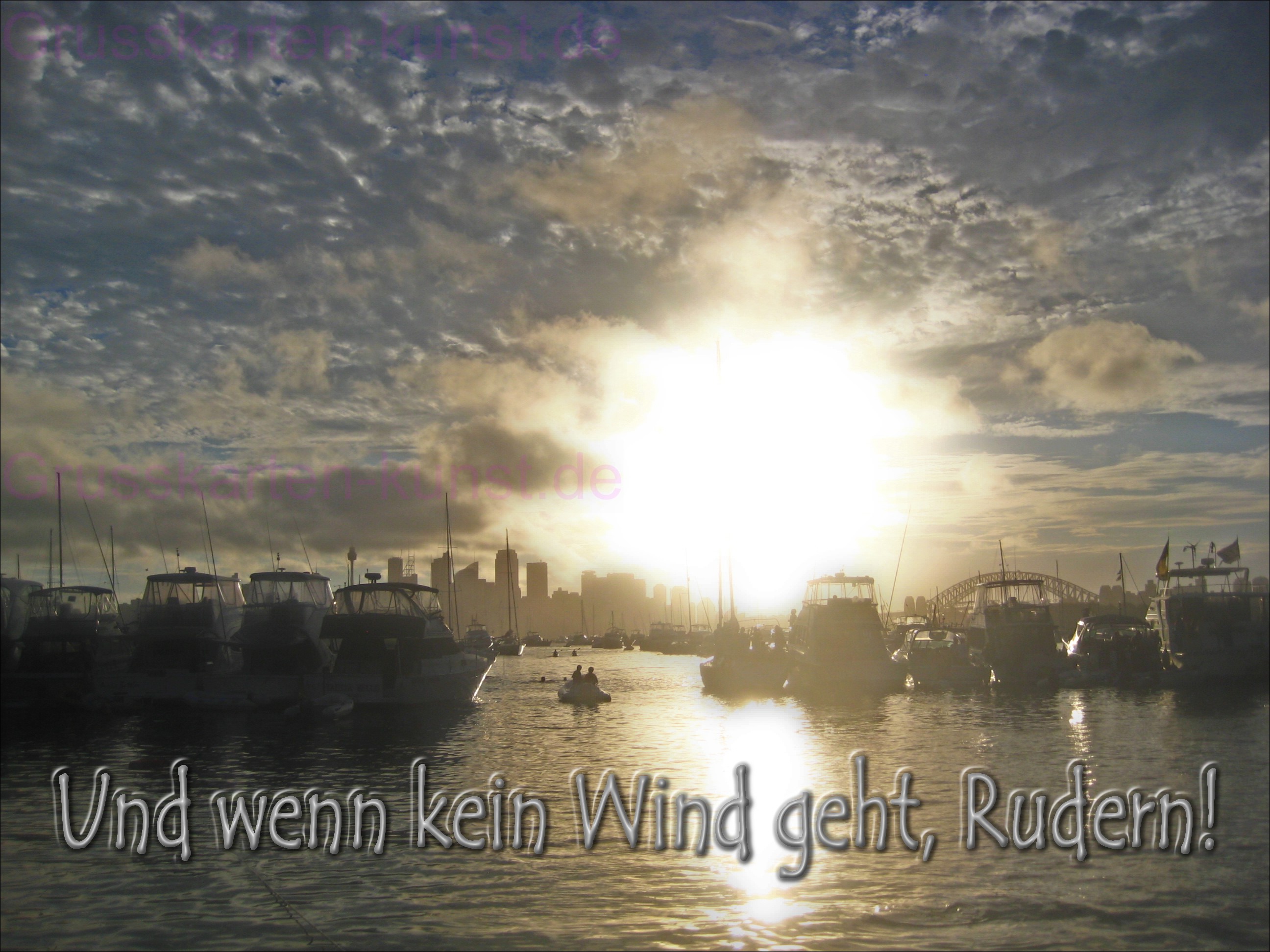 | Z28 "Und wenn kein Wind geht - Rudern!" steht am unteren Rand der Karte. Sie werden von einer silbrig glänzenden, untergehenden Sonne leicht geblendet, während sie vor der Hafenkulisse von Sydney stehen. Über ihnen die schimmernden Wölkchen am blauen Himmel, vor ihnen die glitzernde Wasseroberfläche auf der sich links und rechts die Silhouetten von kleineren Yachten und Booten abzeichnen, im Hintergrund die Harbour bridge. Soll heißen: Manchmal muss man eben nachhelfen... Foto: J. Cremer Mail mit der Karte Z28 versenden Karte Z28 bestellen Karte Z28 vergrößern | |