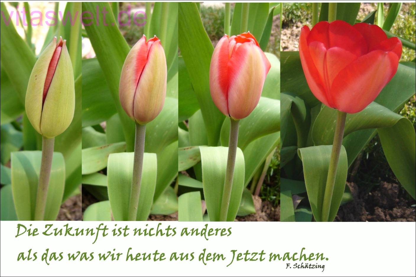 | Z29 "Die Zukunft ist nichts anderes, als das, was wir heute aus dem Jetzt machen." ( F. Schätzing) steht in grüner Schrift auf einem weißen Rand an der Unterseite einer Karte. Hier habe ich eine Tulpe in ihrem Wachstum begleitet und eine Serie von 4 Fotos, im Abstand mehrerer Tage gemacht. Wachstum im Zeitraffer in hochformatigen, schmalen Streifen aneinandergefügt. Zuerst die noch grünen, äußeren Blätter, die leicht aufplatzen, wodurch man das rote innere sieht. Dann die schon fast roten, äußeren Blätter und die etwas größere Öffnung. Jetzt eine vollständig rote Knospe, wobei das innere herauszuplatzen scheint und schließlich die geöffnete, kelchförmige, rote Tulpenblüte. Natur pur. Mail mit der Karte Z29 versenden Karte Z29 bestellen Karte Z29 vergrößern | |