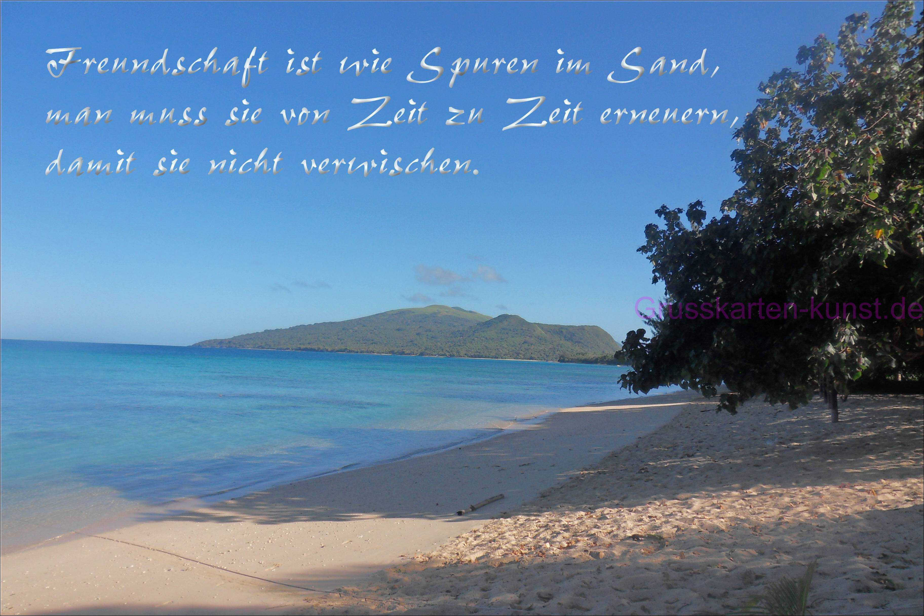 | Z30 „Freundschaft ist wie Spuren im Sand, man muss sie von Zeit zu Zeit erneuern, damit sie nicht verwischen.“ Steht in grauweiß auf dem blauen Himmel der sich im Pazifischen Ozean spiegelt. Diagonal von links unten nach rechts oben schlängelt sich ein flacher, heller Sandstrand mit verwischten Spuren. Rechts davon stehen Laubbäume, durch die das Licht der flach stehenden Sonne auf den Strandstreifen fällt. Im Hintergrund sieht man eine weitere, grün bewachsene Insel aus dem Meer steigen. Pele Island, Vanuatu (Foto J. Cremer) Mail mit der Karte Z30 versenden Karte Z30 vergrößern | |
