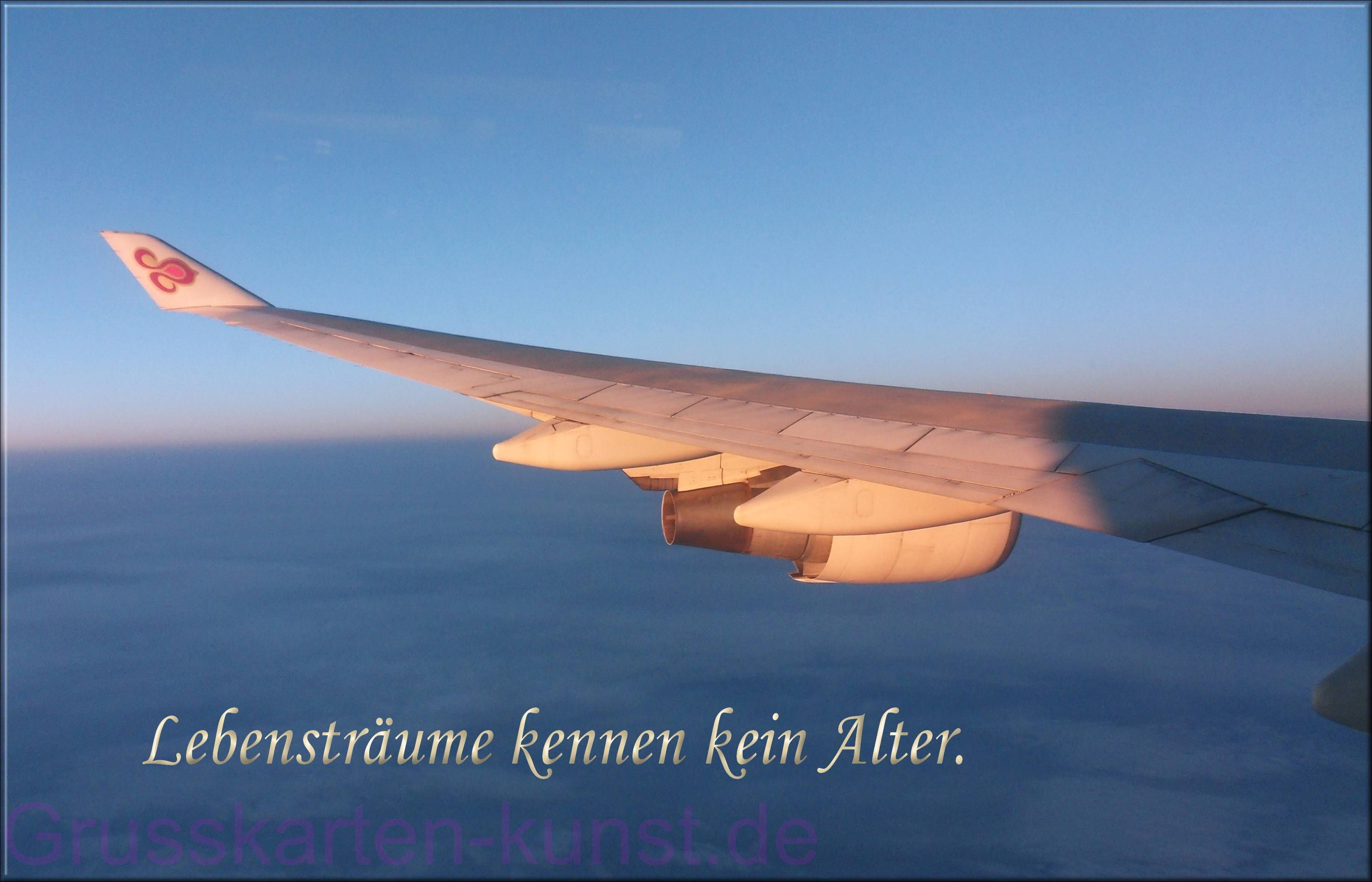 | Z31 "Lebensträume kennen kein Alter" steht am unteren Rand der Karte. Diese zeigt einen vom Sonnenlicht angestrahlten Flügel eines Flugzeuges über dem blauen Pazifik. Der Horizont teilt die Karte mittig in zwei unterschiedliche Blautöne (Meer, Himmel). Aus dem Flugzeug raus. Mail mit der Karte Z31 versenden Karte Z31 vergrößern | |