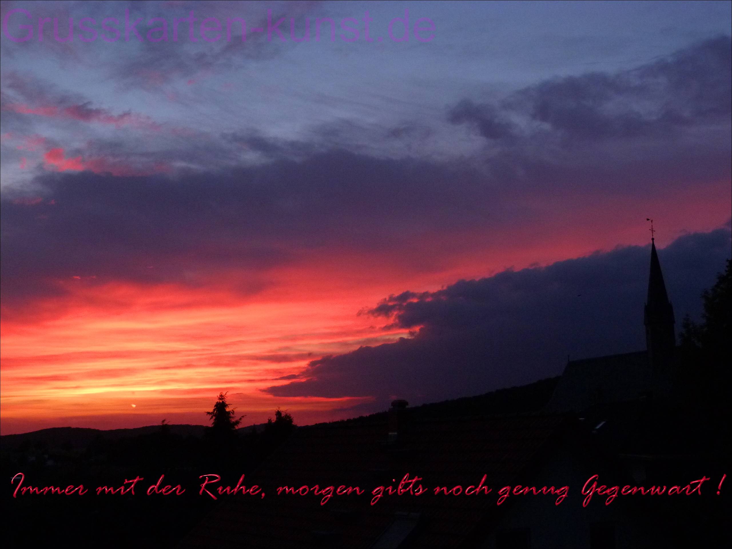 | Z34 "Immer mit der Ruhe, morgen gibts noch genug Gegenwart!" steht in dunkelroter Schreibschrift am unteren Rand der Karte. Zu sehen ist ein sehr dunkel- glutroter Sonnen- untergang mit Resten von Gewitterwolken, Schleierwolken und Schäfchenwolken, die in unterschiedlichen Farben angestrahlt werden. Das obere Drittel des Bildausschnittes ist von schönsten Blautönen. Im unteren Teil sieht man die Silhouette eines Kirchturms und einer Tannenspitze sowie einen hügeligen Horizont. Warm, beruhigend, wunderbar. Mail mit der Karte Z34 versenden Karte Z34 versenden | |