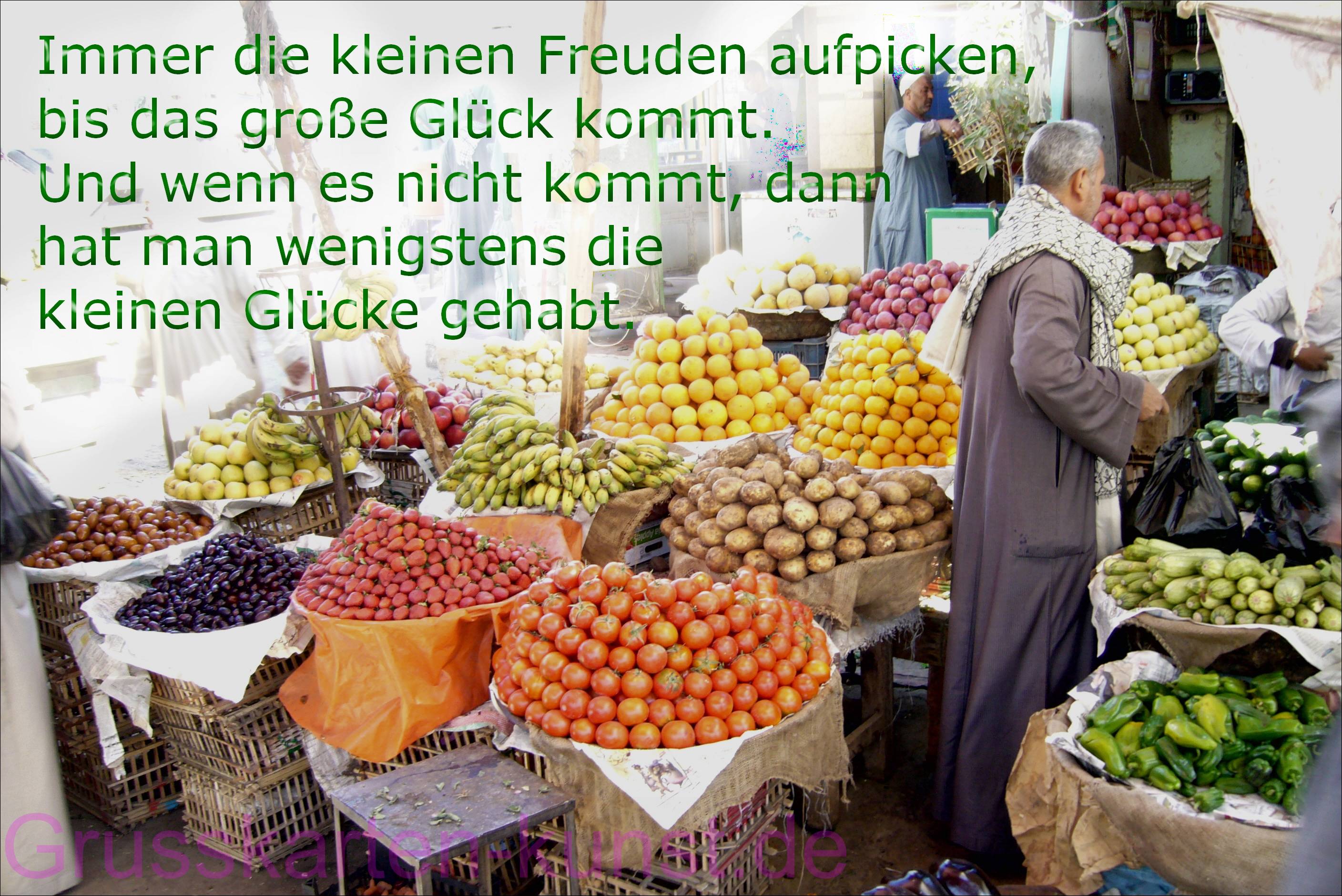 | Z37 "Immer die kleinen Freuden aufpicken, bis das große Glück kommt, und wenn es nicht kommt, hat man wenigstens die kleinen Glücke gehabt". (T. Fontane) Dieser Spruch steht in grüner Schrift oben auf der Karte. Zu sehen ist ein ägyptischer Marktstand. Auf je 3 gestapelten Weidenkisten ist jeweils eine ca. 70 cm große, runde Schale mit einem weißen, orangenen oder beigen Stofftuch bedeckt. Auf dieser Schale haben die Ägypter ihr Obst und Gemüse zu kegelförmigen Pyramiden aufgeschichtet. Von manchen dieser Schalen wurde bereits vom hinteren Teil Ware entnommen, sodass verschieden hohe Türme entstehen. Hier sieht man 18 verschiedene Früchte in bunten Farben. Von grüner Paprika über braune Datteln, bis hin zu Erdbeeren, Zitronen, Orangen, Kartoffeln, Bananen, Äpfeln Zuccini und Tomaten. Zwei mit typisch dunklem Gewand (Dschallabija) und Schal angezogene Männer, die handeln oder Ware tragen stehen inmitten dieser bunten Vielfalt. Liebevolle Dekoration am Nil in Edfu. Mail mit der Karte Z37 versenden Karte Z37 vergrößern | |