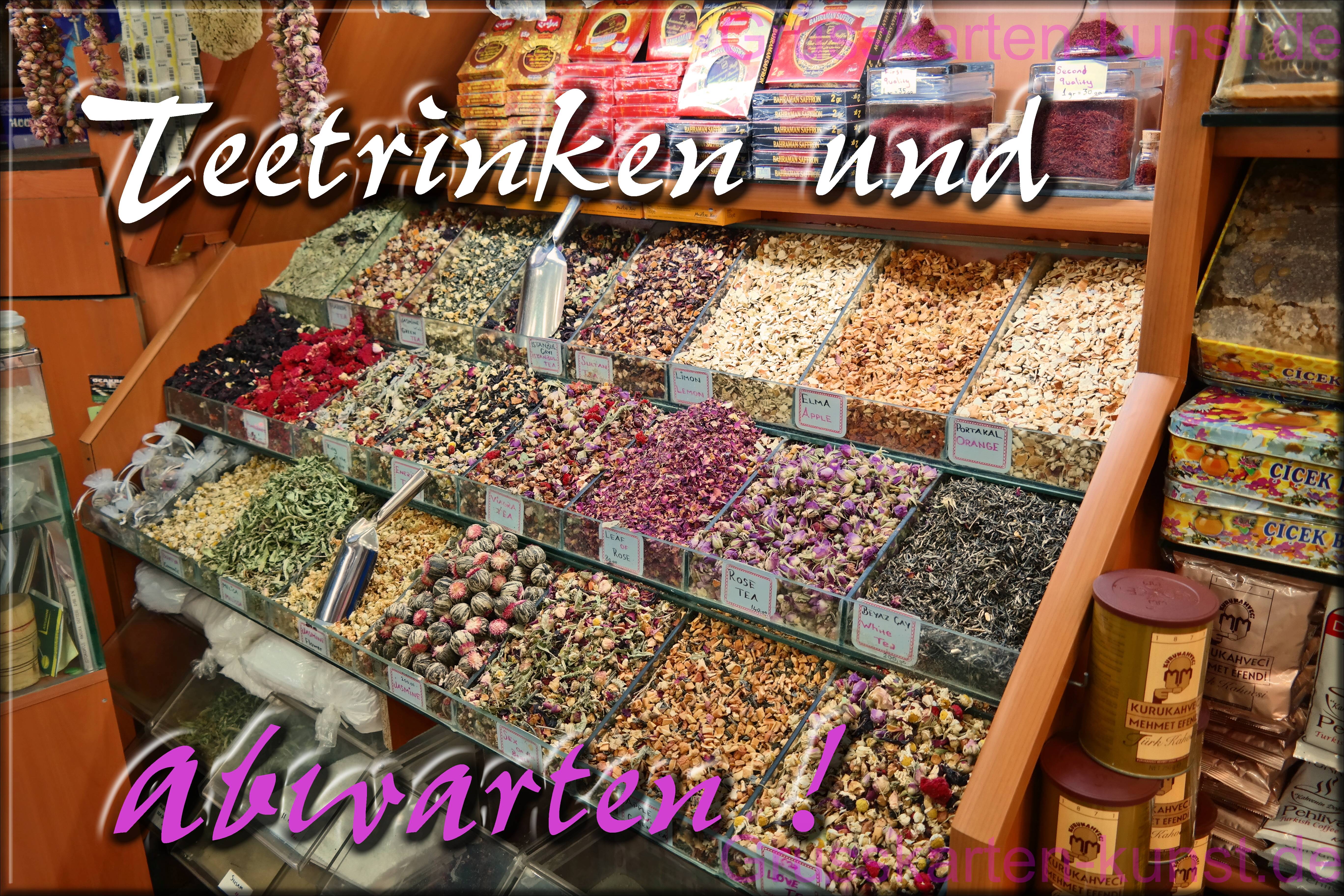 | Z38 "Teetrinken und.... abwarten" steht auf der Karte, die einen "Gweürzstand" in der Istanbuler Markthalle zeigt. Statt Gewürzen sind hier viele verschiedene, verschiedenfarbige, verschieden kleine und große Blüten und Blatter in zahllosen, schräg aufgestellten Fächern aufbewahrt. Zart filigrane Vielfalt in gedeckten Farben. Spruch ist bewusst verdreht, so braucht man ihn anders! Mail mit der Karte Z38 versenden Karte Z38 vergrößern | |