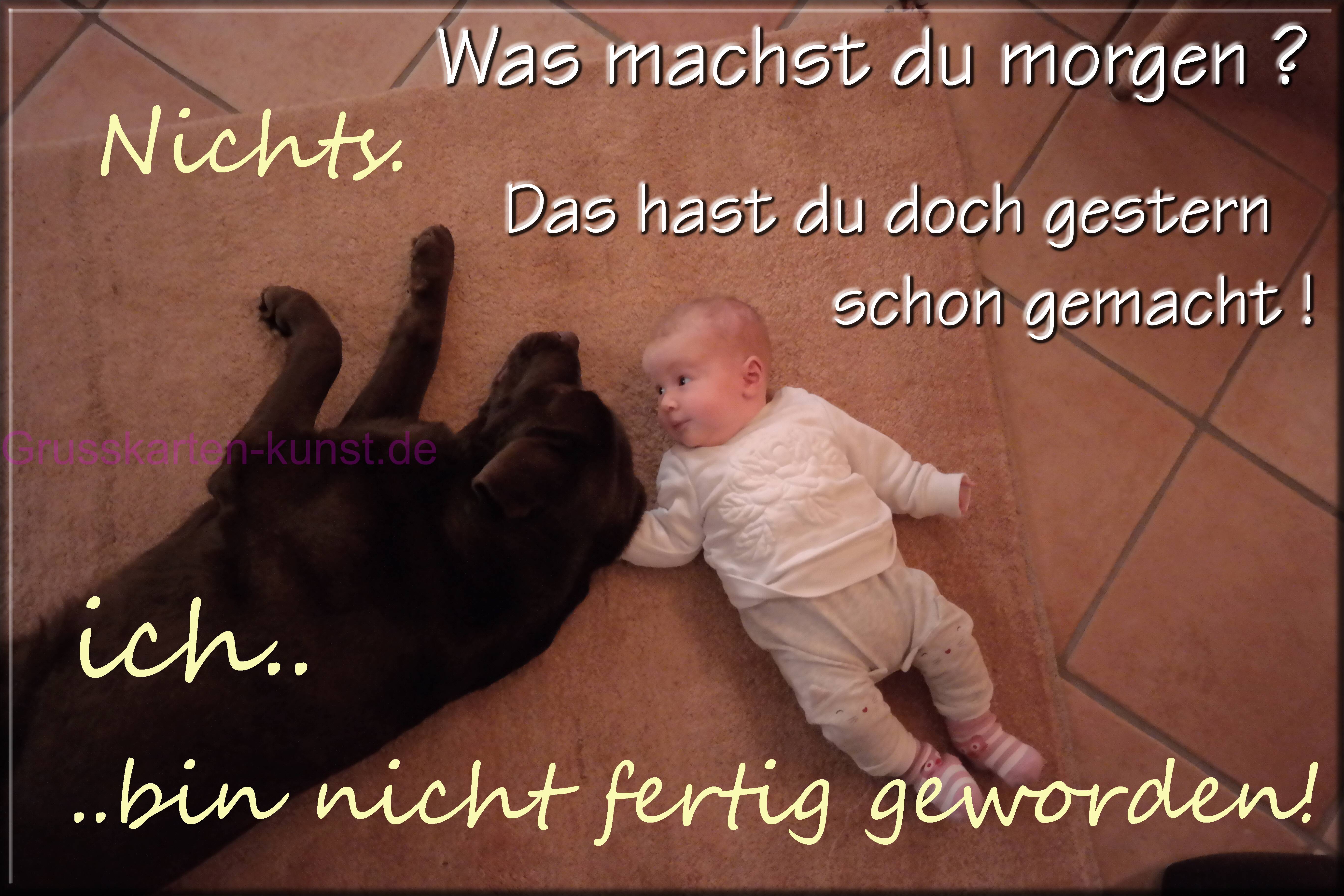 | Z39 "Was machst du morgen?" - "Nichts." - "das hast du doch gestern schon gemacht?!" - "Ich... bin nicht fertig geworden!" steht in zwei verschiedenen "Sprecherfarben" auf der Karte. Hier liegt ein brauner Hund auf der Seite, streckt die Pfoten von sich und döst. Daneben liegt ein Baby in grau-weißer Kleidung, hat die Hand zum Hund gestreckt und schaut, Kopf an Kopf liegend, in dessen Augen. Hintergrund terracottafarbener Teppich und Fliesen. Gönn es Dir! Mail mit der Karte Z39 versenden Karte Z39 vergrößern | |